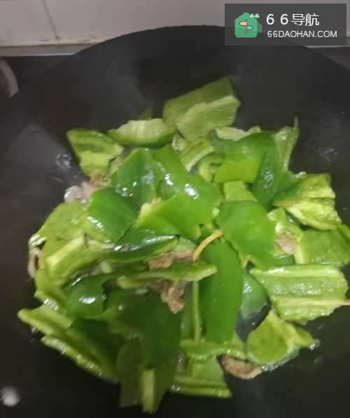 5翻炒大约35分钟,炒至青椒断生即可出锅装盘。