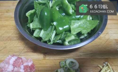 首先准备好食材,青椒掰成小块,猪肉切薄片,葱切片,姜切丝。