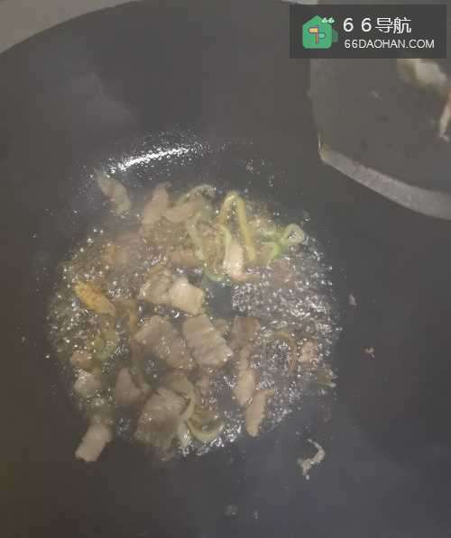 3放入猪肉翻炒,变色后加入葱花和姜丝炒香。