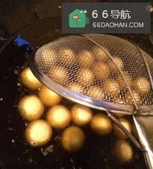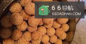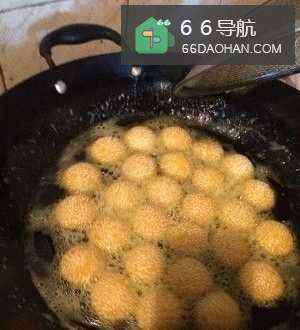 4冷油小火入锅炸,用冷油是为了防止芝麻糊掉,用铲子围绕一个圆不停翻动,让芝麻球受热均匀,受热不均就是油锅里的炸弹