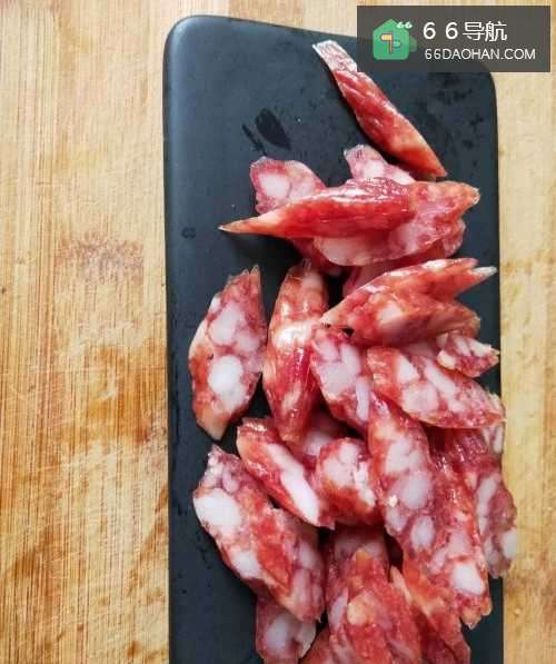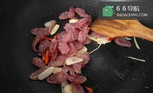 5放入腊肠翻炒1分钟;