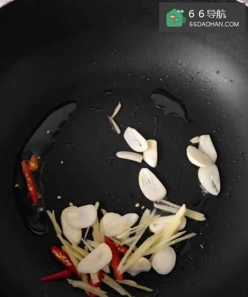 4起锅热油,放入姜丝、蒜片小米椒爆香;