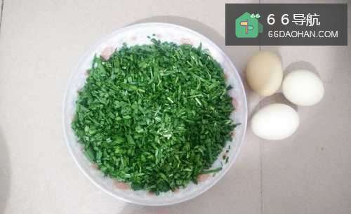2将洗净的韭菜切碎,准备三个鸡蛋。