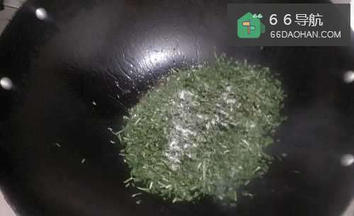5当锅够热的时候,将韭菜倒进锅里,撒上适量盐,进行翻炒后摊平,倒上一些水。