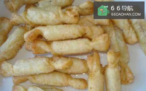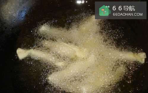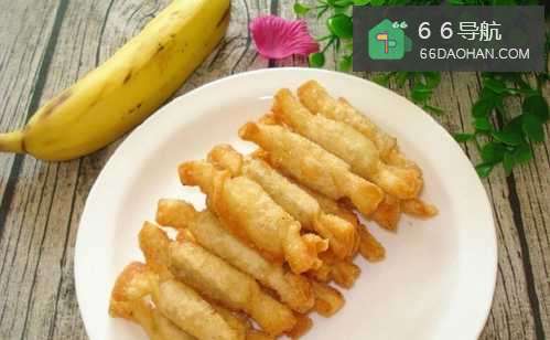 4锅中放入适量的油,当油温三成热时放入香蕉糖果,小火慢炸。
