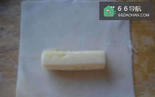 2取一张馄饨皮,将香蕉切成块放在上面。