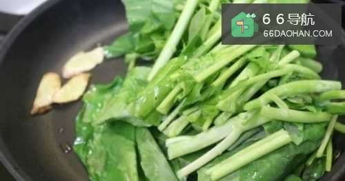 3.爆香姜片,等香气出来之后,再把芥蓝菜、2小匙米酒拌炒,酒的功用可以让芥蓝菜清脆不变黑