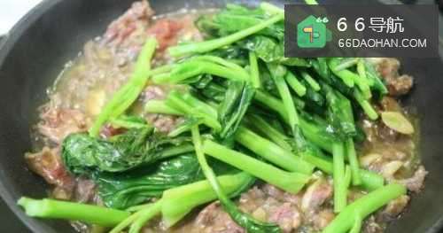 8陆续将熟芥兰菜下锅和牛肉一起混匀炒到入味,如果喜欢沙茶酱的人这时候可以添加一小匙,增加风味,最后少许的盐、糖调整味道。