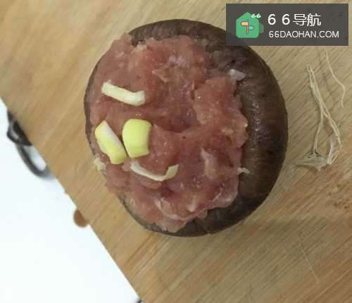 2拿出一个香菇,盛一勺肉馅放在香菇里,稍微按一按,为了美观可以在上面放一点葱末,增加色彩