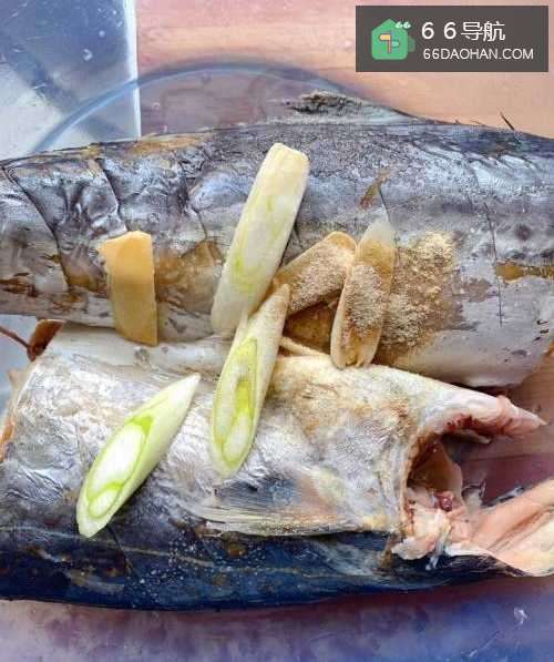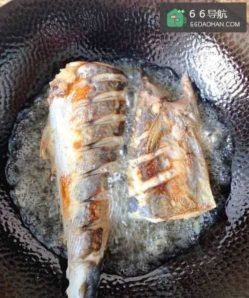 4锅内加油,六成油温下入鲅鱼,煎至两面微黄。