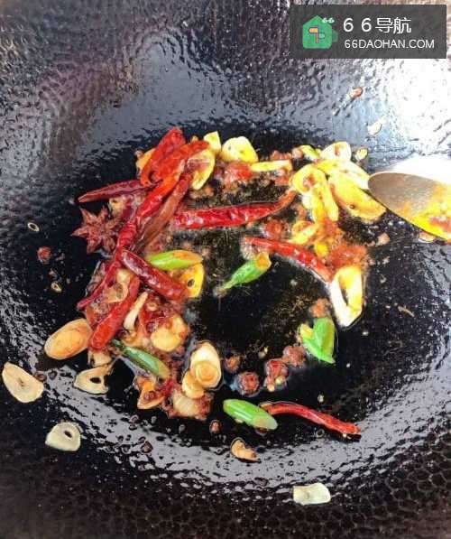 5锅内加少许油,下入小料,小火炒香,加1勺豆瓣酱炒出红油,烹入料酒,加酱油、蚝油炒香,加入适量清水,加入老抽调色。