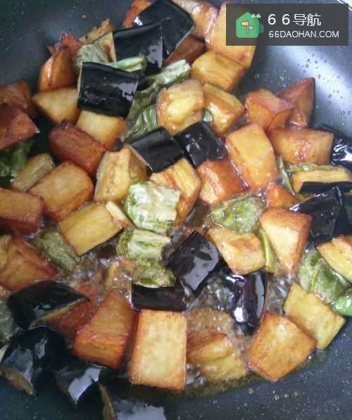 11再放入 土豆 茄子 青椒 ,加生抽 盐