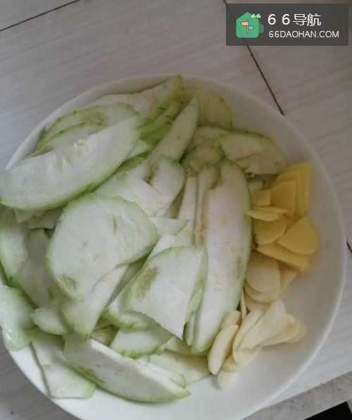 2将丝瓜切成厚薄均匀的片,姜蒜同理,装盘。