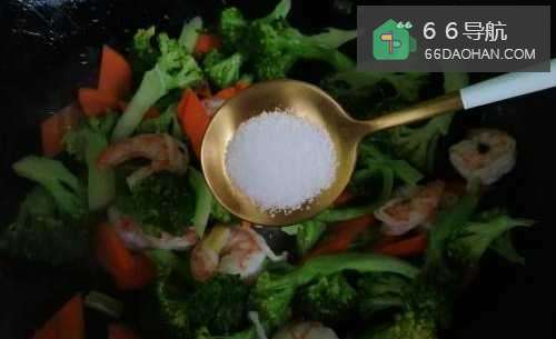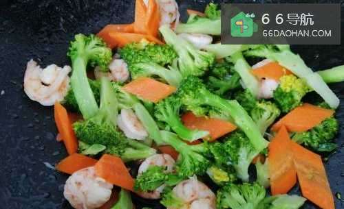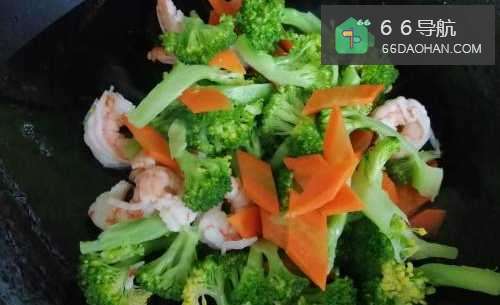 9锅里狠兼放油,放西兰花胡萝卜虾仁轿兼翻炒