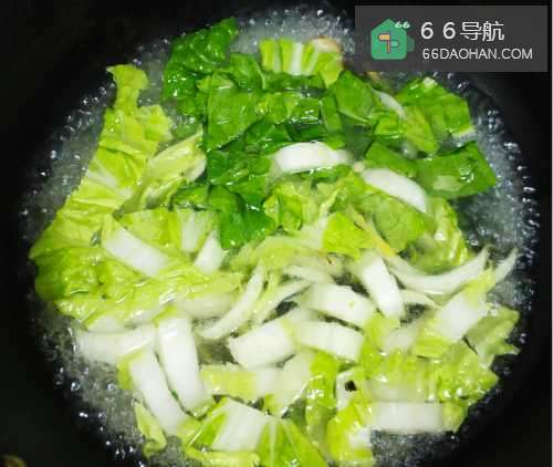 3爆香后,倒入半碗(最后盛汤的大碗)清水,大火煮沸后,倒入白菜。