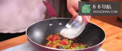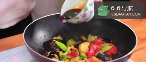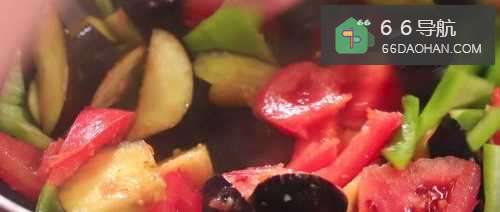 6倒入茄子炒软后,再倒入西红柿和青椒,翻炒均匀