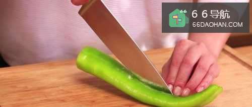 3青椒去蒂,从中间切开,去籽并切三角形块