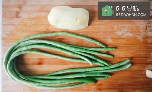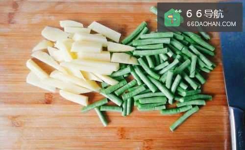 2将豆角切成3里面左右的段,土豆也切成差不多长度的长条状。