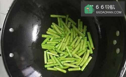 4接下来,先放入切好的豆角,中火翻炒一分钟左右,直至变色。