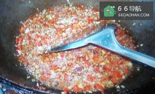 44、锅里倒油,把辣椒,大葱,大蒜,姜和酱放到锅里炒一炒,把所有的味道融入到一起。