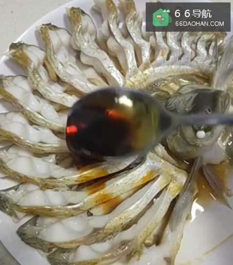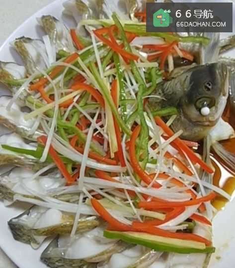 5淋上蒸鱼鼓油,放上姜葱,青红椒丝;