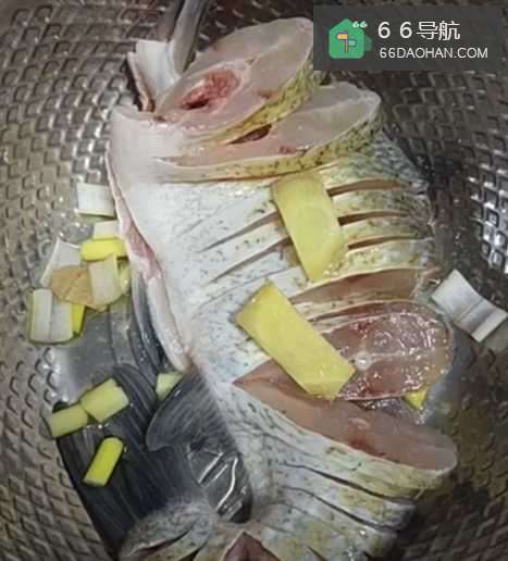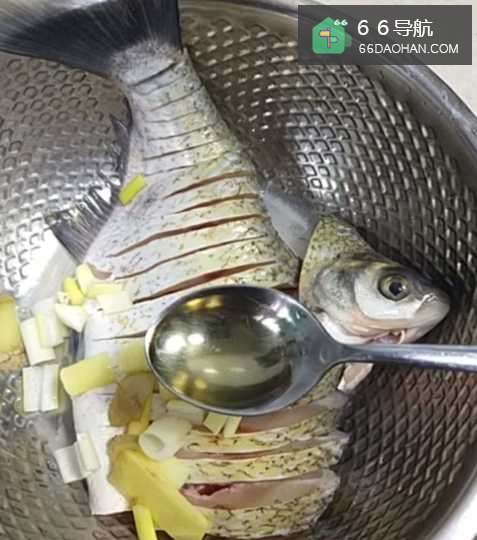 4放上姜片,蒸鱼鼓油上锅蒸12分钟,倒掉多余的水;