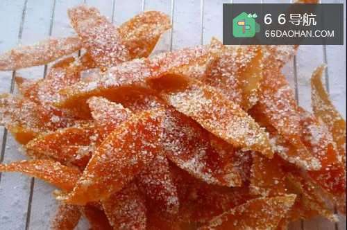4等到橘皮煮的变透明,锅中的水变干,就可以用铲子翻炒了,直到把橘子皮上面炒出糖霜,就可以出锅了。