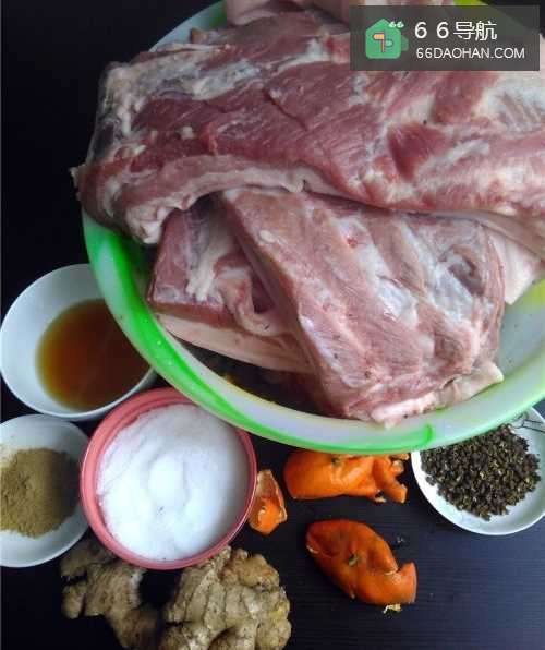 备好原材料带皮五花肉,盐,老姜,陈篇之皮,料酒,花椒,五香粉。