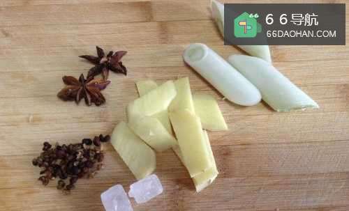 3准备辅料葱切断,姜切片,花椒1小把,大料两粒,冰糖两块,豆瓣辣酱两勺。