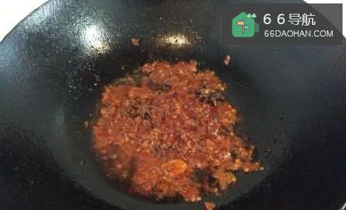 4锅里放些油,放入豆瓣辣酱2汤勺,小火慢炒,炒到油变红,放两块冰糖。