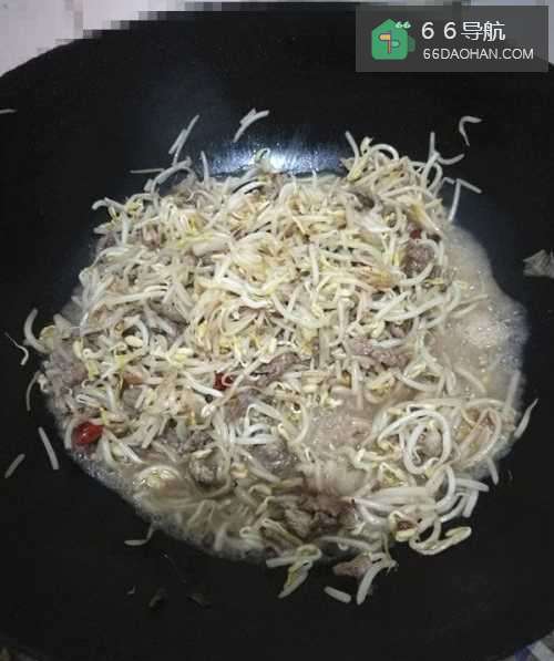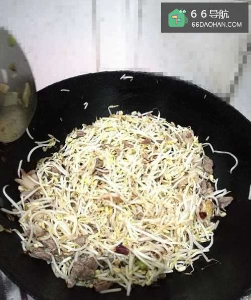 肉炒至上色后,将沥干水的豆芽放入,翻炒片刻。