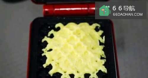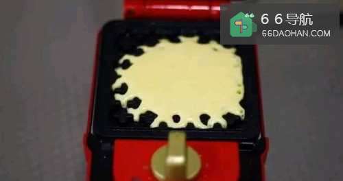 如果是制作圆形或不规则型华夫饼,面糊直接倒入中间,如果是制作正方形,倒面糊时需要把底盘所有的位置都填满;设置时间三分钟。