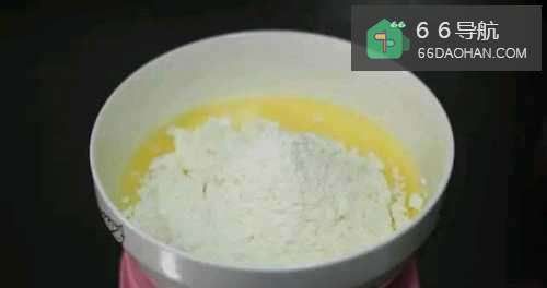3将鸡蛋与牛奶的混合液体搅拌均匀之后分别筛入普通面粉、低筋面粉和泡打粉。