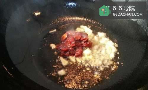 3锅里底油放入蒜末和郫县豆瓣酱小火翻炒12分钟。