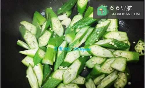 7先将秋葵放入,中火翻炒一会,待有七八分熟后再加入煎好的肉松鸡蛋,将其捣碎,然后混合炒一会,加入各种调味料,炒匀后即可关火装盘了。