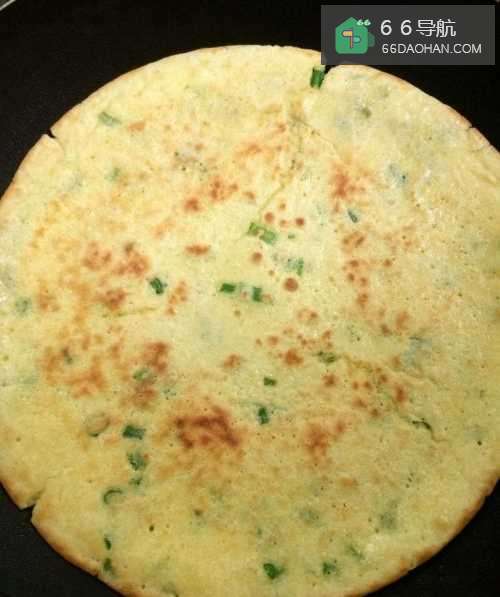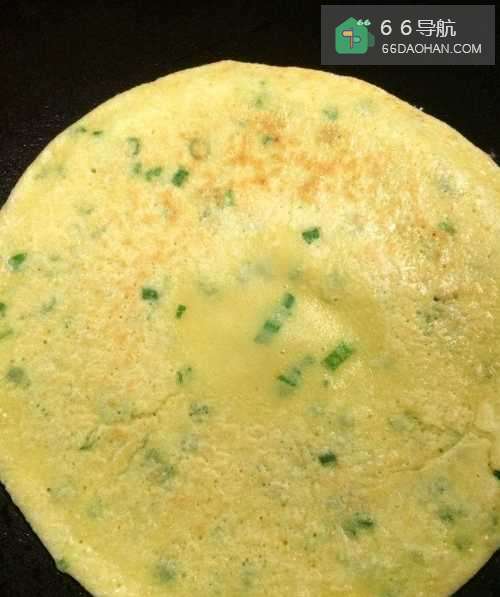 9当面糊形成圆饼后,可以开打大点火煎,这时饼子在锅里可以移动了,拿起平底锅,让饼子在锅里不停转动,让饼子受热均匀