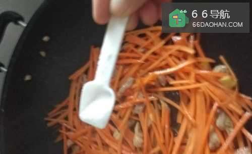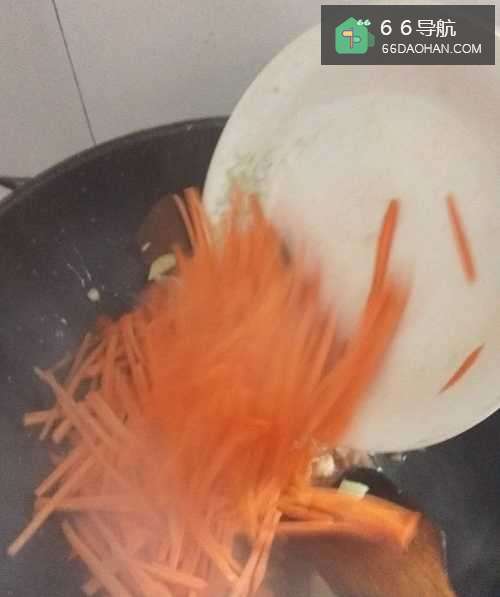 6待肉变成白色,即可加入红萝卜丝。