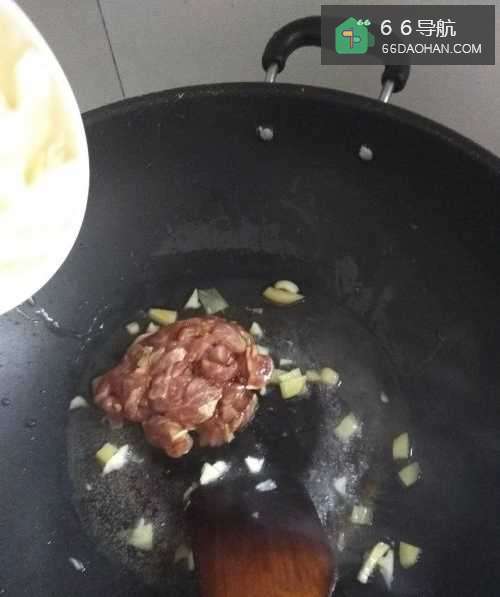 5然后先倒入肉,下去翻炒