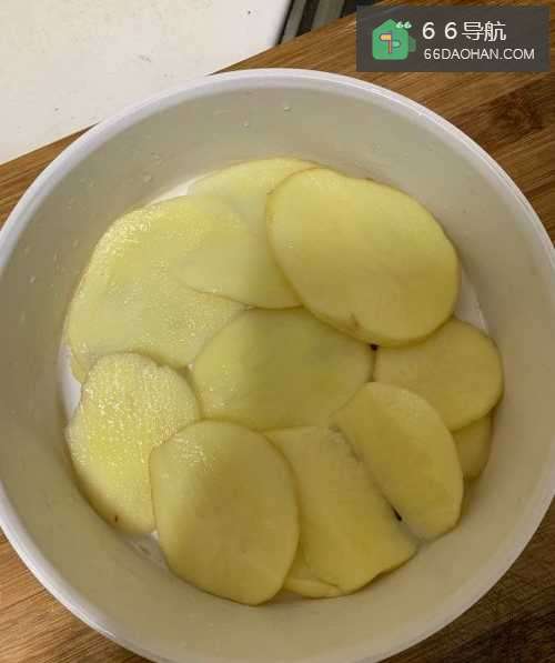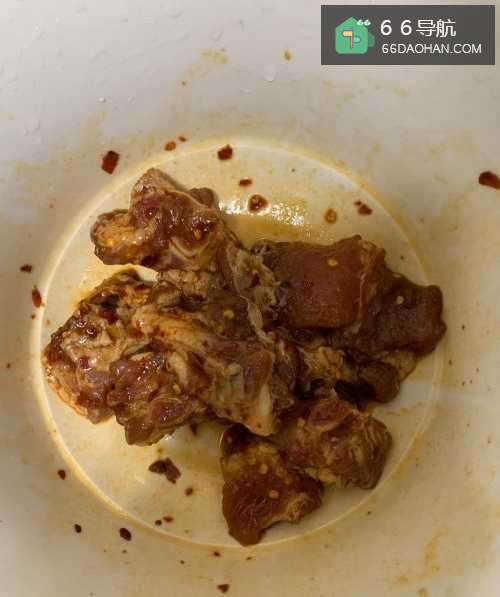410分钟后,将粉蒸肉粉慢慢加入,直至与排骨揉搓匀称,粉会附着在排骨上,越揉越大,适量即可,然后将弄好的排骨,均匀的放置在铺满土豆片的蒸具上。