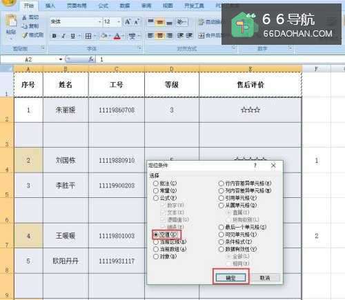 7选中表头以下表格,按【ctrl+G】,【定位条件】选择【空值】,点击【确定】