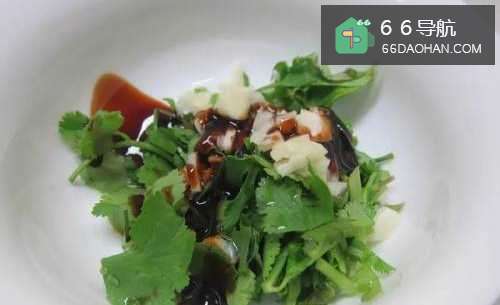 2香菜洗净切小段,蒜切碎,和酱油素蚝油拌在一起