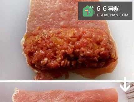 4在肉片一端铺上绞肉馅(约100g),再将肉片卷起,黏合处可抹些太白粉帮助黏合。