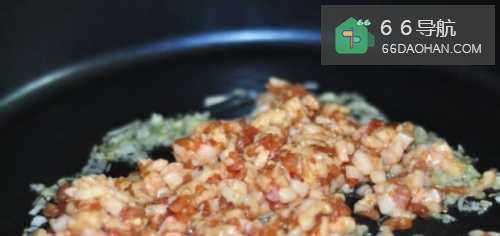 5然后,接着放入肉沫,炒出油。