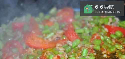 7这时候,我们加入西红柿块,小火翻炒均匀,盖上盖焖至豆角熟透。
