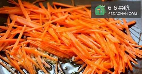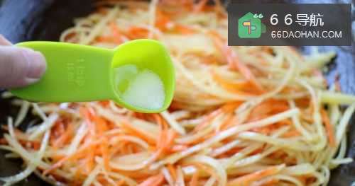5锅内倒入适量的色拉油,倒入大蒜末、胡萝卜丝翻炒均匀;再放入土豆丝翻炒至变软。