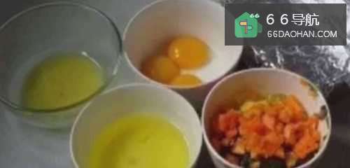 2我们把鸡蛋清黄都给它们分开了,姜榨汁,咸蛋皮蛋切碎,葱花取一容刷层,我们都把它们都这样做好了,
