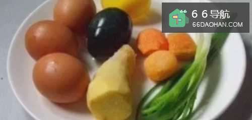 在我们做这个三色蒸蛋的时候就应该吧要做的材料都准备好,皮蛋,姜,葱花,咸蛋黄,