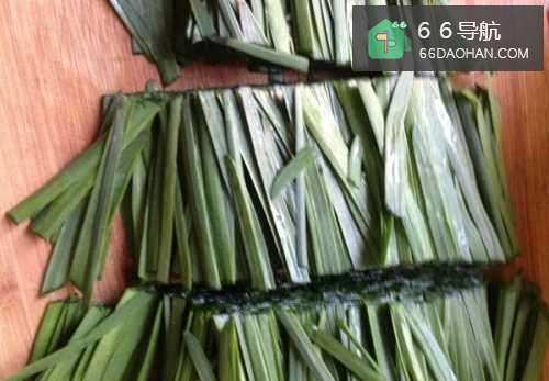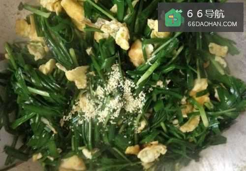 6韭菜炒软,放入盐、鸡精,炒匀。