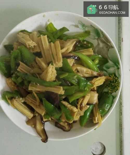 一道色香味俱全的辣椒香菇炒腐竹就完成了。