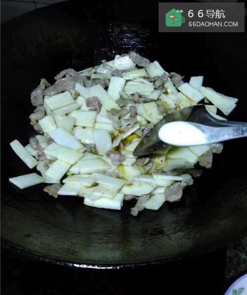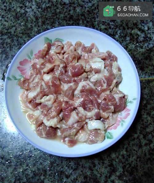 2猪瘦肉洗净,切成肉片;然后用适量淀粉、盐抓匀后腌制片刻。